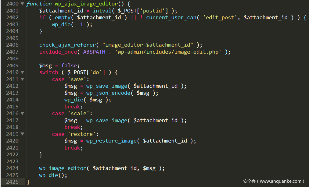 可以看到check_ajax_referer( ‘image_editor-‘ . $attachment_id, ‘nonce’ );这一句对nonce进行了校验。所以要nonce参数和id参数保持不变。