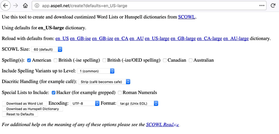 为了识别嵌入的单词,我们需要一个英语单词的词汇表。英语单词的一个来源是SCOWL( Spell Checker Oriented Word Lists and Friends)。我们将使用web接口来创建实际使用的列表: