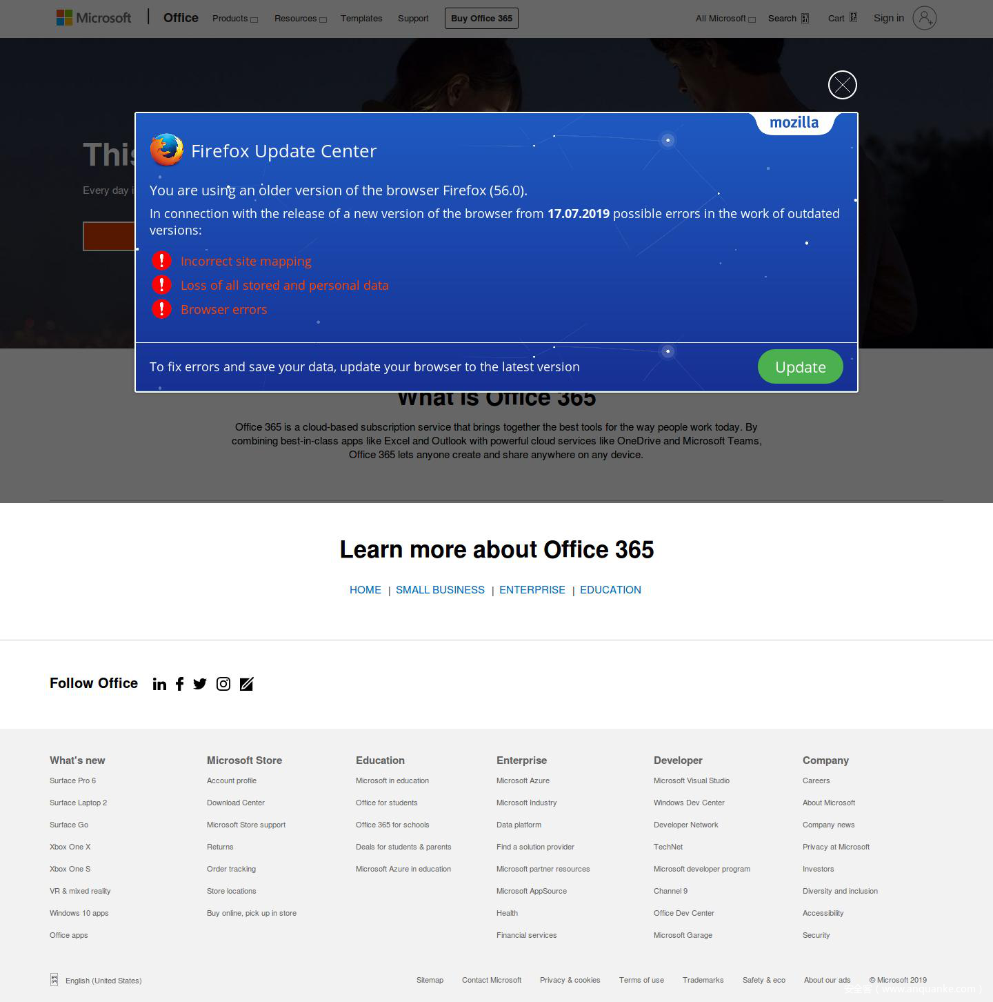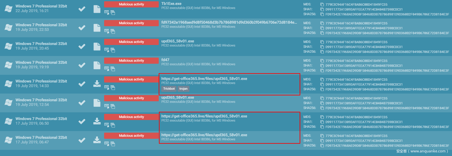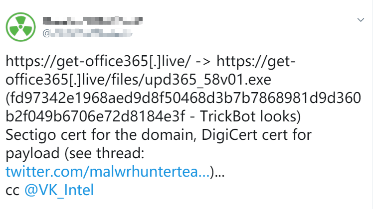 TrickBot银行木马是一款专门针对各国银行进行攻击的恶意样本,它之前被用于攻击全球多个国家的金融机构,主要通过钓鱼邮件的方式进行传播,前不久还发现有黑产团伙利用它来传播Ryuk勒索病毒,最近MalwareHunterTeam的安全专家发现一个虚拟的Office 365网站,被用于传播TrickBot银行木马,相关的信息,如下所示: