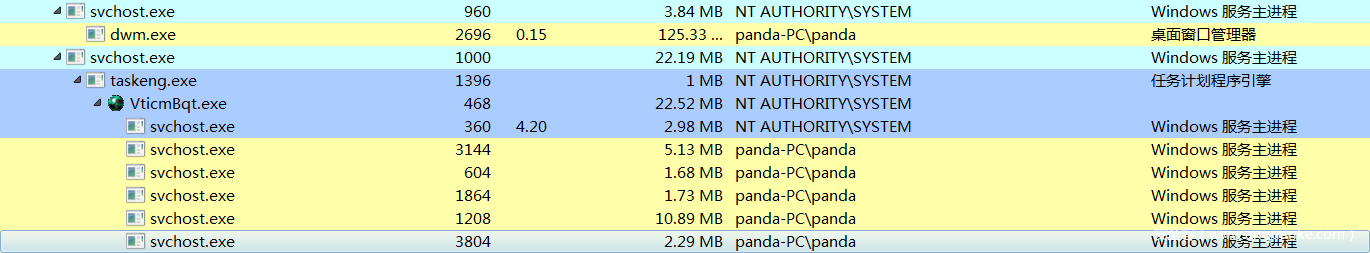 4.跟之前TrickBot银行木马一样,启动svchost进程,然后将相应的模块注入到svchost进程,如下所示: