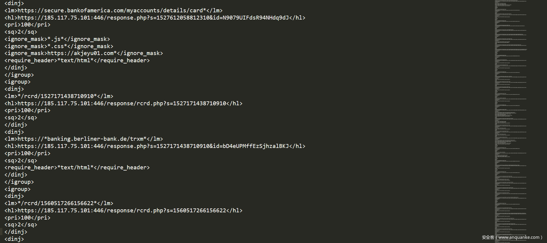 6.TrickBot银行木马为了免杀,从远程服务器上下载回来的模块都是加密后的数据,再将这些数据解密,然后注入到svchost进程中,通过本地解密脚本,解密出来的模块,如下所示:
