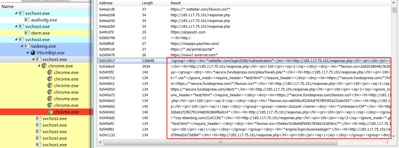 里面包含了全球各大网上银行网站,这个模块注入的svchost进程中,当受害者访问这些网站的时候,盗取网站登录凭证等,从内存中可以看到这些银行网址等信息,如下所示: