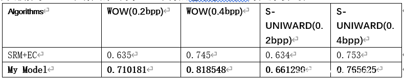 上图中,SRM+EC代表传统的手工提取特征的隐写分析模型,看结果可知,本文的模型对两种隐写算法的检测准确率都很高,超过了传统的隐写分析模型,具备良好的效果