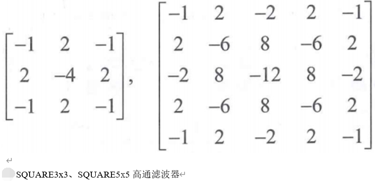对于线性残差而言,上图已给出一阶、二阶、三阶线性残差的计算方式,以此类推,不难发现,SQUARE、EDGE3x3与EDGE5x5线性残差只是在计算中使用了更多方向的邻域像素。SQUARE、EDGE3x3与EDGE5x5高通滤波器如上图。在实践中,线性残差的计算方法通过分配率运算可转换为图像和高通滤波器的卷积运算,如下:
