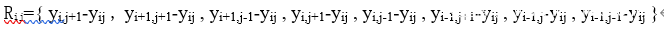以一阶残差为例,要获得一阶非线性残差,首先通过计算获得所有一阶线性残差,再统计其最大最小值即求得两个一阶非线性残差。下图是一阶线性残差原型,yij即待求取残差位置的像素值,yi,j+1即待求取残差位置的像素值的一个邻域像素值。