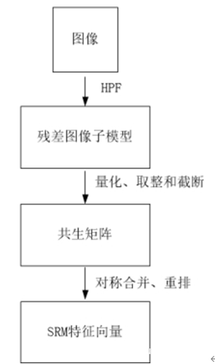 上图是SRM隐写分析特征的提取方法。首先通过高通滤波器获取残差图像子模型,再通过量化、取整和截断提取每一幅残差图像子模型的四阶共生矩阵,最后将这些共生矩阵的元素重新排列构成隐写分析特征。