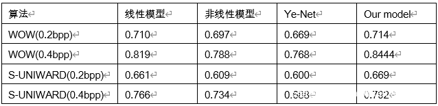 本文称仅模拟线性残差特征提取的隐写分析模型为‘线性模型’,仅模仿非线性残差特征提取的隐写分析模型为‘非线性模型’,同时模拟线性和非线性残差特征提取的隐写分析模型为‘our model’,实现的隐写分析实验如下表。