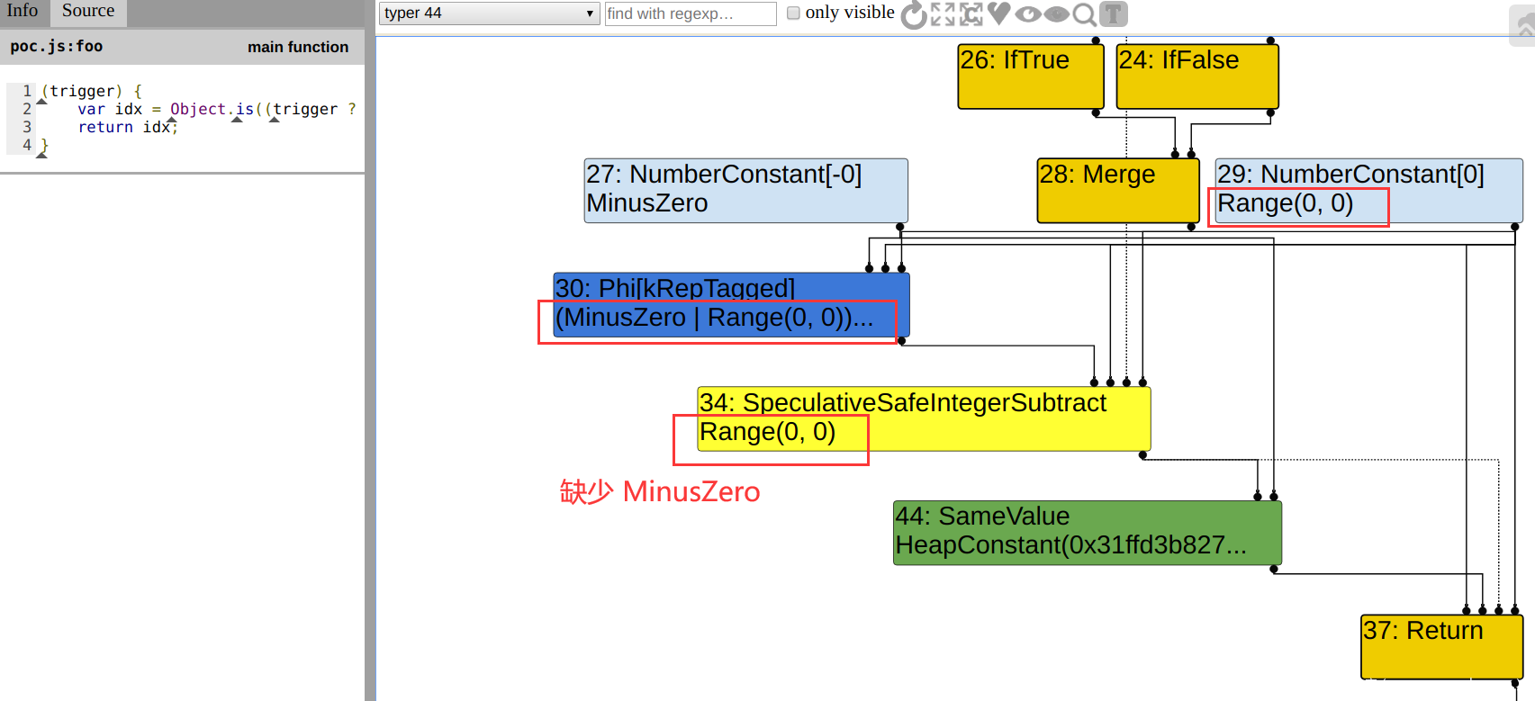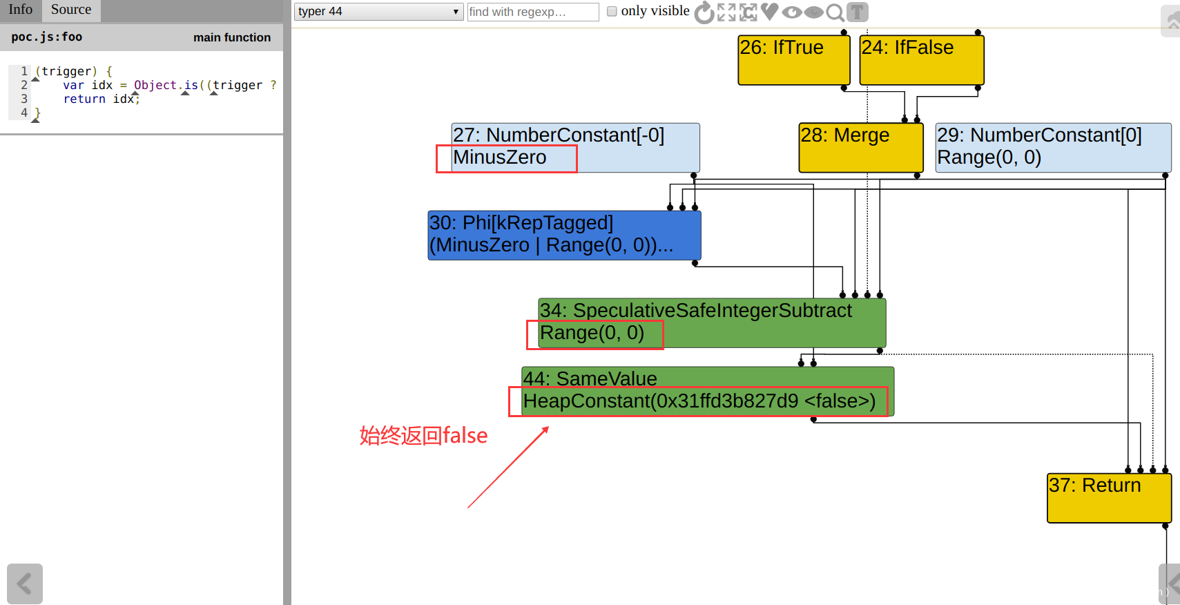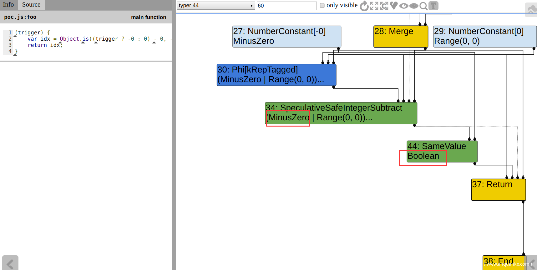 可以看到,SpeculativeSafeIntegerSubtra 的 Type 包含了 MinusZero 这种类型,因此下面的 SameValue 的类型也不再固定为 false, 而是不确定的 Boolean。
