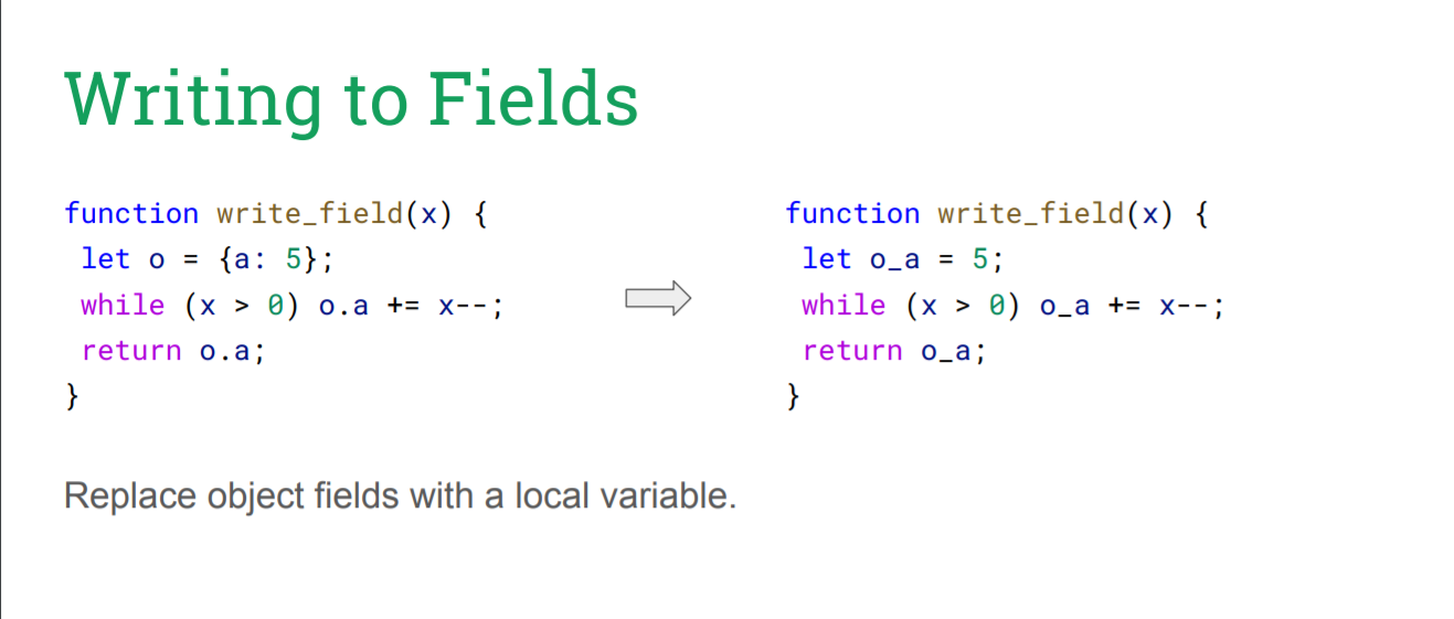 需要注意的是,Escape Analysis 对函数的 type feedback有一定的要求。如果目标函数只运行了一次,那么 escape analysis 分析效果非常的差,基本上无法分析出任何有用的东西,包括刚刚说的 LoadField 替换也无法完成。因此必须在优化前多执行几次目标函数。
