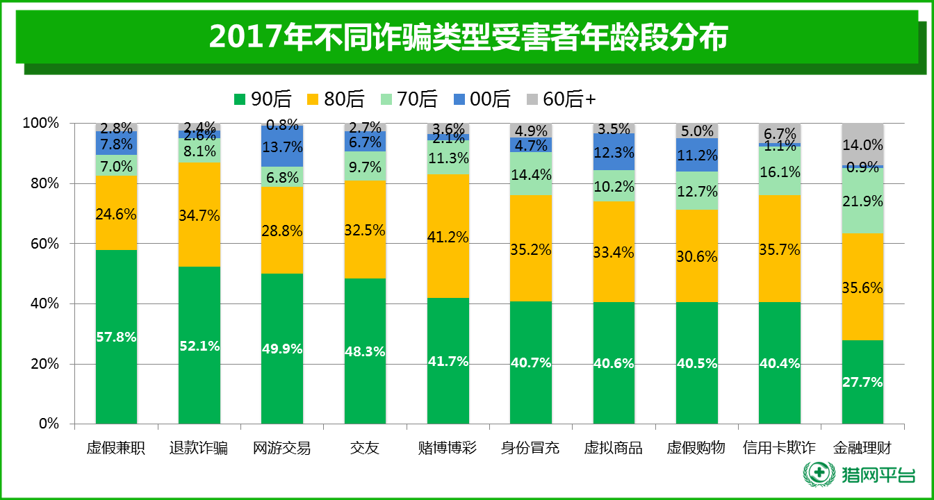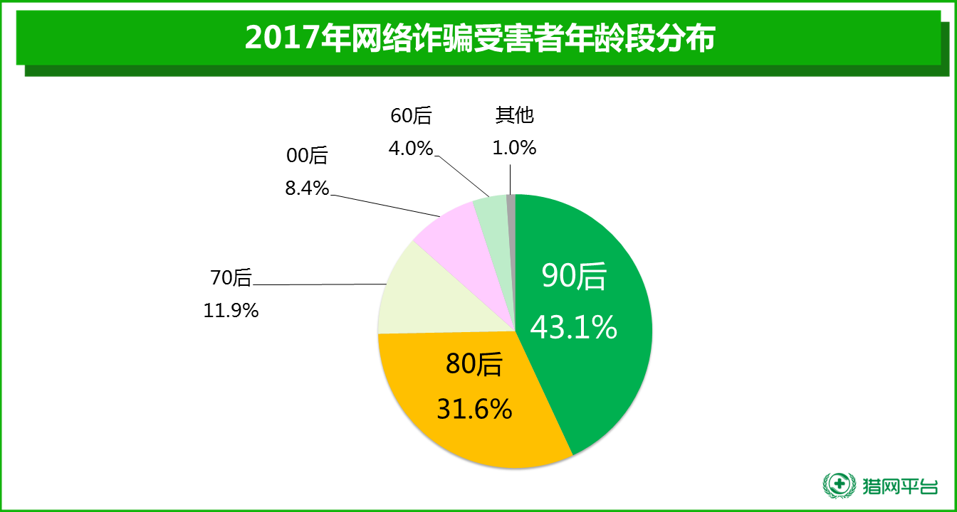 - 90后的网络诈骗受害者占所有受害者总数的43.1%,其次是80后占比为31.6%,70后占比为11.9%,00后占比8.4%,60后占比为4.0%,其他年龄段仅占1.1%。特别值得注意的是,00后遭遇网络诈骗开始增多,2016年仅有3.0%的00后进行举报,而今年却增长到8.4%,可见随着00后年龄的不断增长,其也渐渐成为网络诈骗的重要目标。