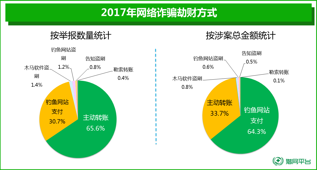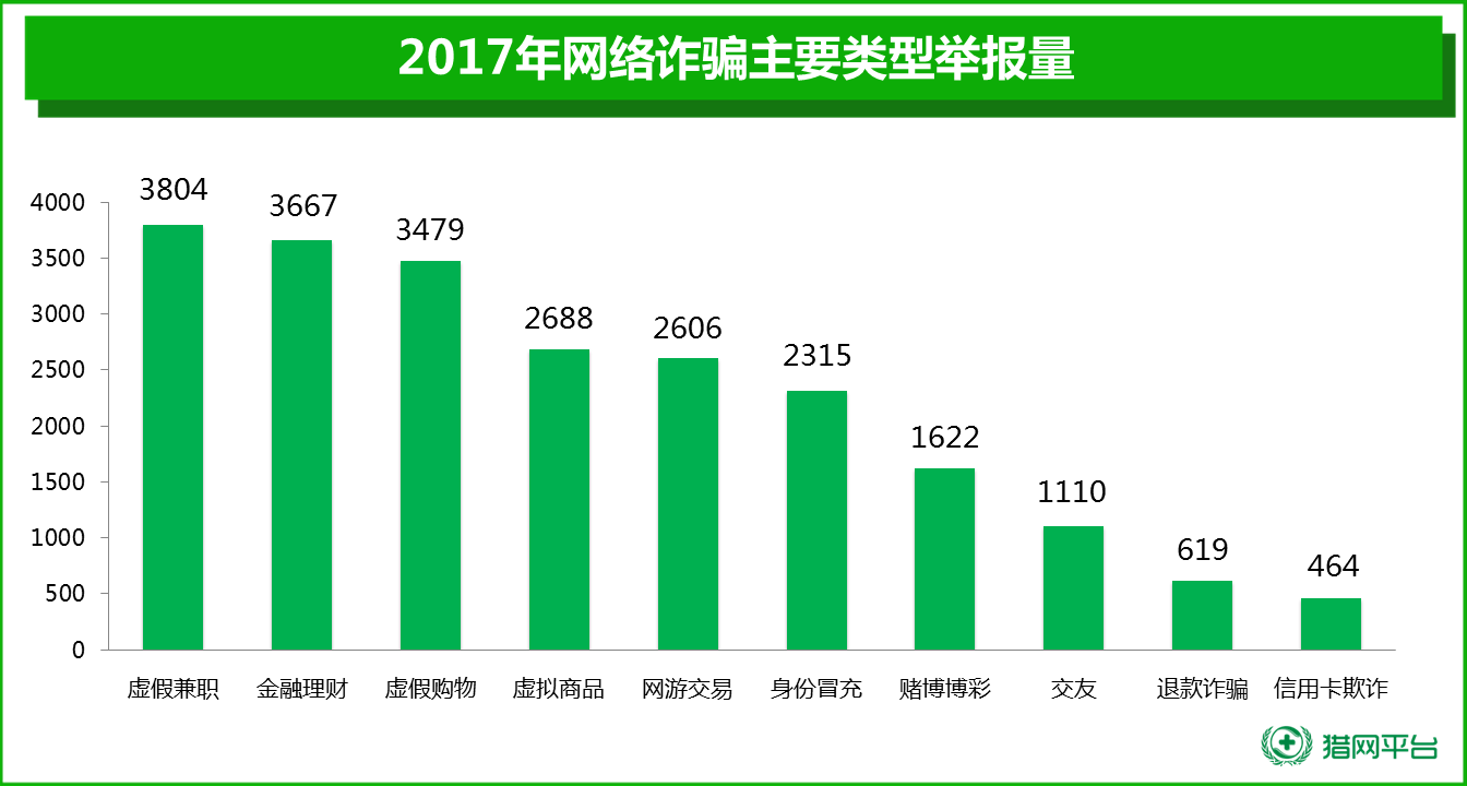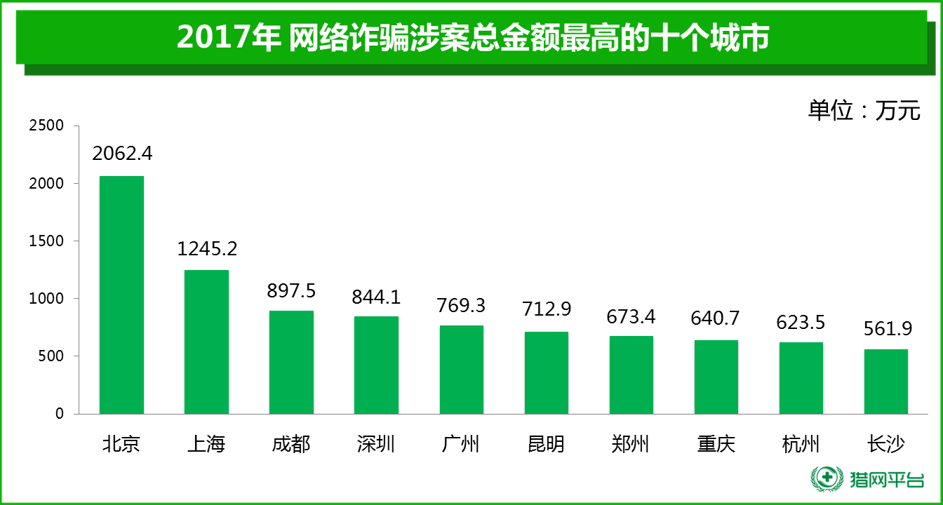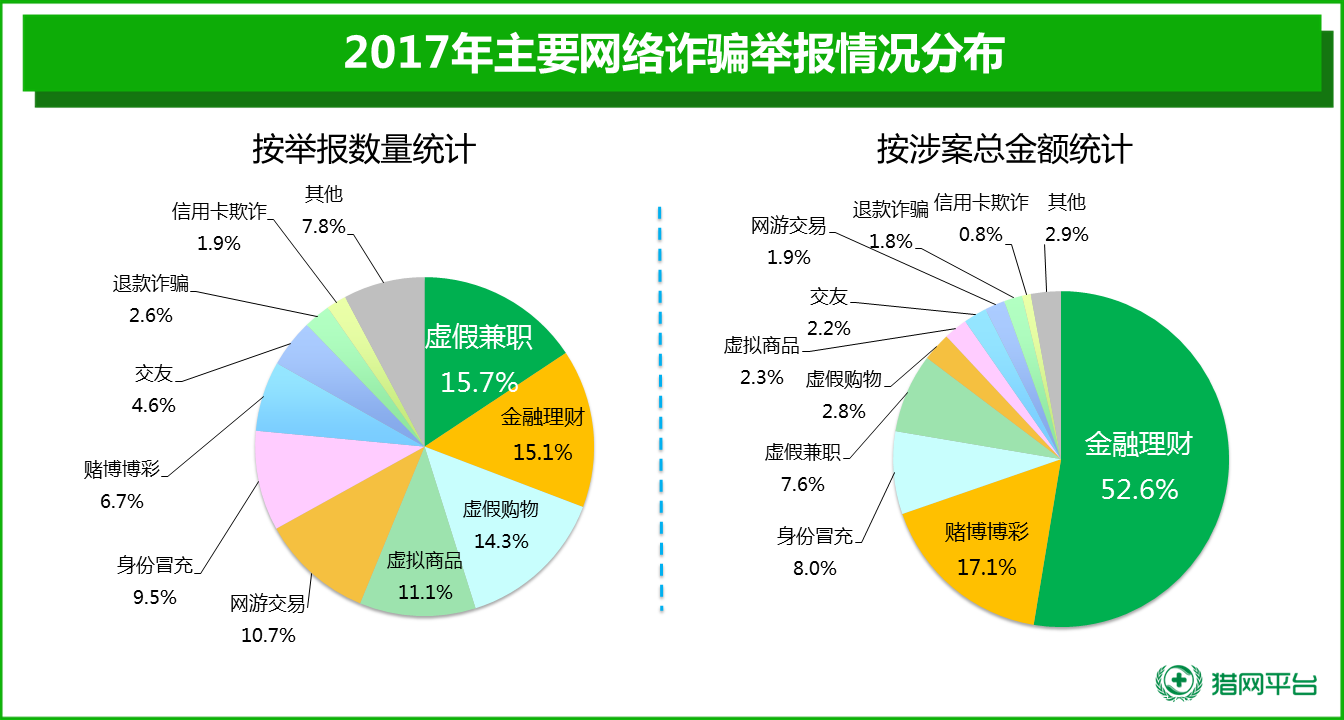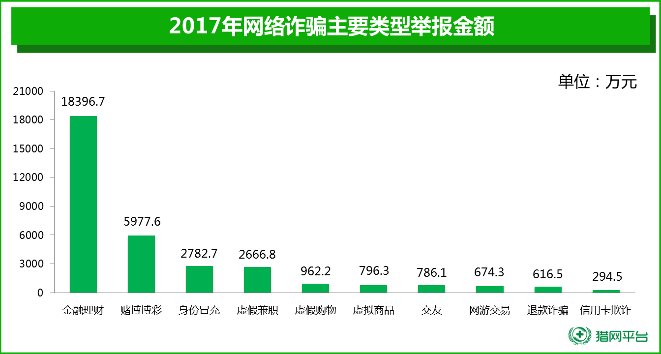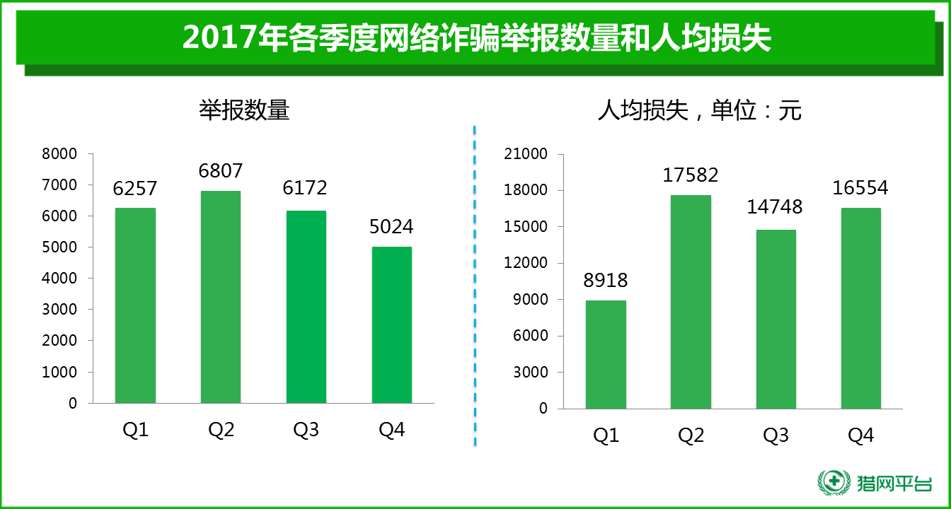 - 2017年猎网平台共收到全国用户提交的有效网络诈骗举报24260例,举报总金额3.50亿余元,人均损失14413.4元。与2016年相比,网络诈骗的举报数量增长了17.6%,人均损失却增长了52.2%。