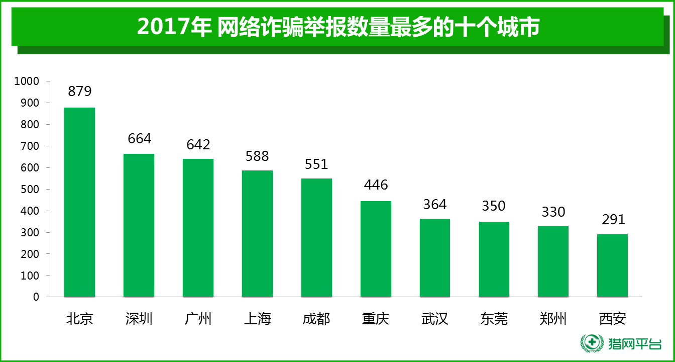 从各城市网络诈骗的举报量来看,北京是举报人数最多的城市,为879起,其次深圳664起、广州642起、上海588起、成都551起、重庆446起、武汉364起、东莞350起、郑州330起和西安291起。
