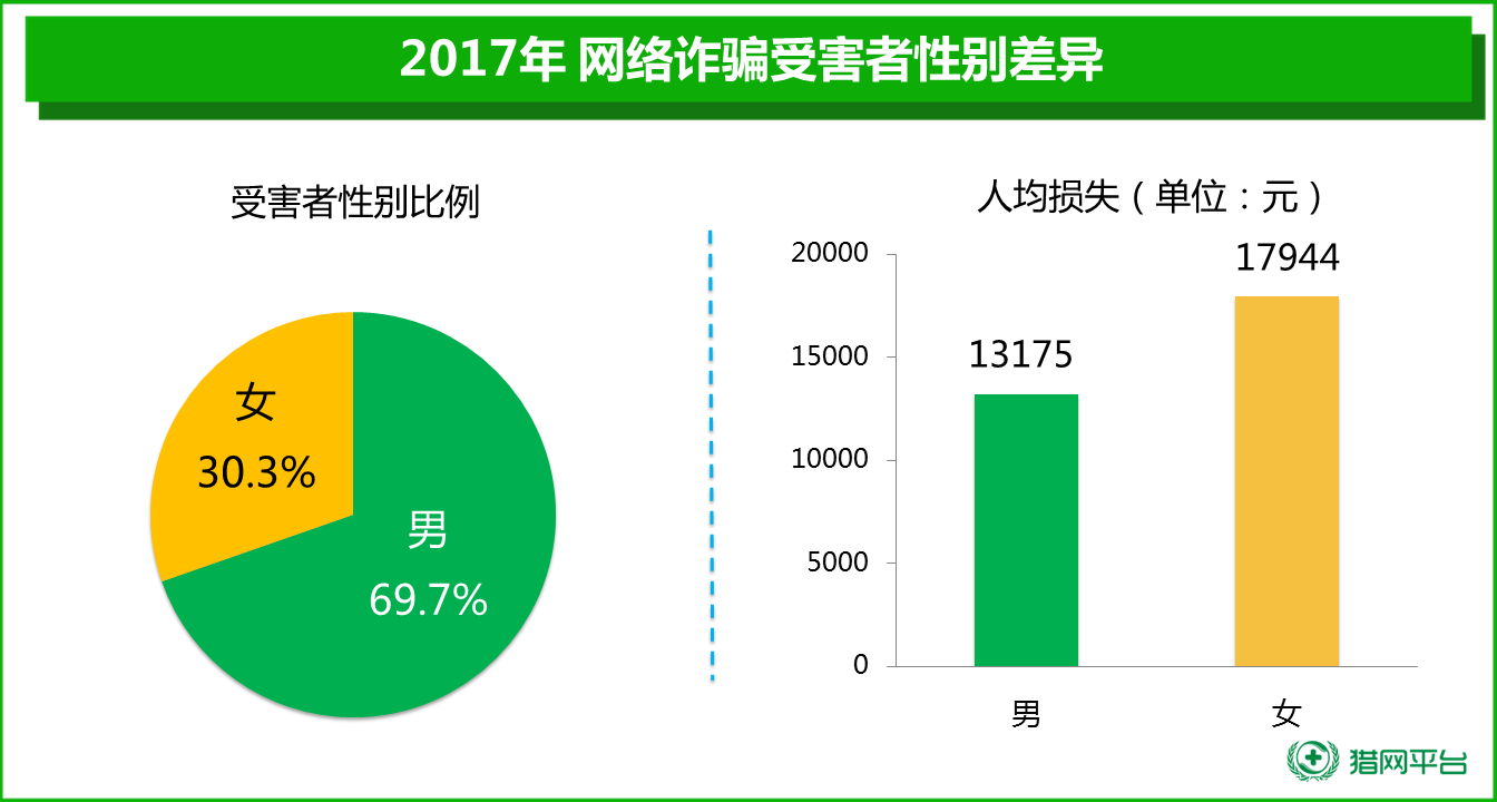 - 从举报用户的性别差异来看,男性受害者占69.7%,女性占30.3%,男性受害者占比大大高于女性。但从人均损失来看,男性为13175元,女性为17944元。