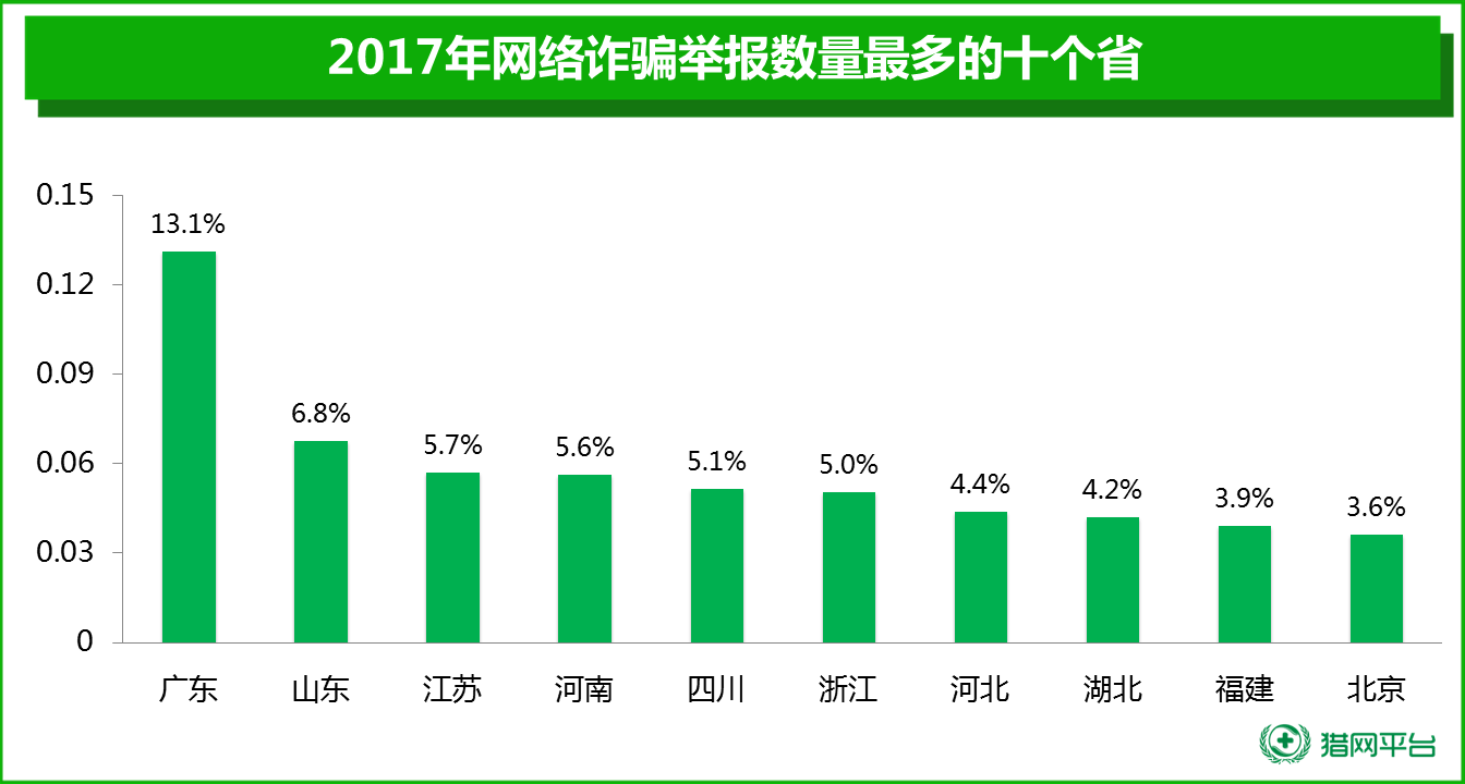 - 广东(13.1%)、山东(6.8%)、江苏(5.7%)、河南(5.6%)、四川(5.1%)、浙江(5.0%)这6个省级行政区的被骗用户最多。举报数量约占到了全国用户举报总量的41.4%。