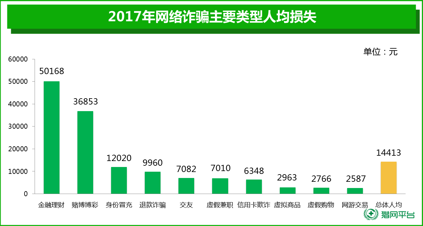 2017年,猎网平台共收到全国用户提交的有效网络诈骗举报24260例,举报总金额3.50亿余元,人均损失14413.4元。与2016年相比,网络诈骗的举报数量增长了17.6%,人均损失却增长了52.2%。2014-2017年统计以来,每年的人均损失均出现大幅增长,可见网络诈骗正在严重的威胁着网民的财产安全。