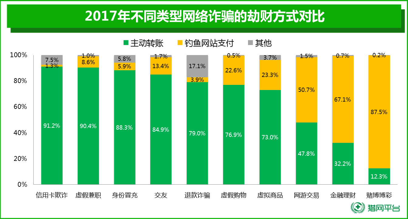 在猎网平台2017接到的用户举报中,有15911人是通过银行转账、第三方支付、扫二维码支付等方式主动给不法分子转账,占比65.6%,其次有7442人在虚假的钓鱼网站上支付,占比30.7%;安装木马软件从而被盗刷的用户有328人,占比1.4%;在钓鱼网站上填写用户的账号、密码等隐私信息后,被盗刷的用户有302人,占比1.2%;主动告知告知账号密码/二维码/验证码/付款码盗刷从而被盗刷的有185人,占比0.8%,还有88人遭到勒索软件、恐吓电话等被勒索盗刷,占比0.4%。