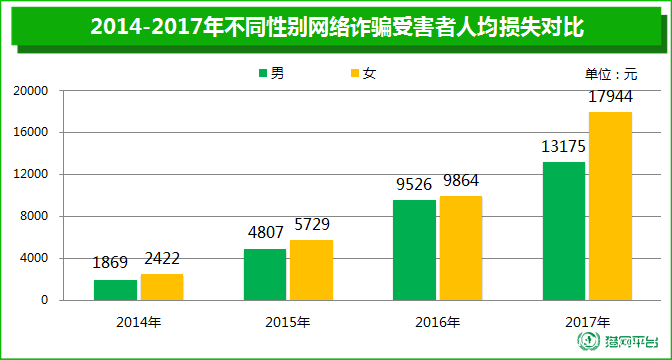 从受害者人均经济损失来看:2017年,男性受害者人均损失较2016年增长了38.3%;而女性受害者人均损失较2016年增长81.9%,可见女性受害者人均损失大幅升高。