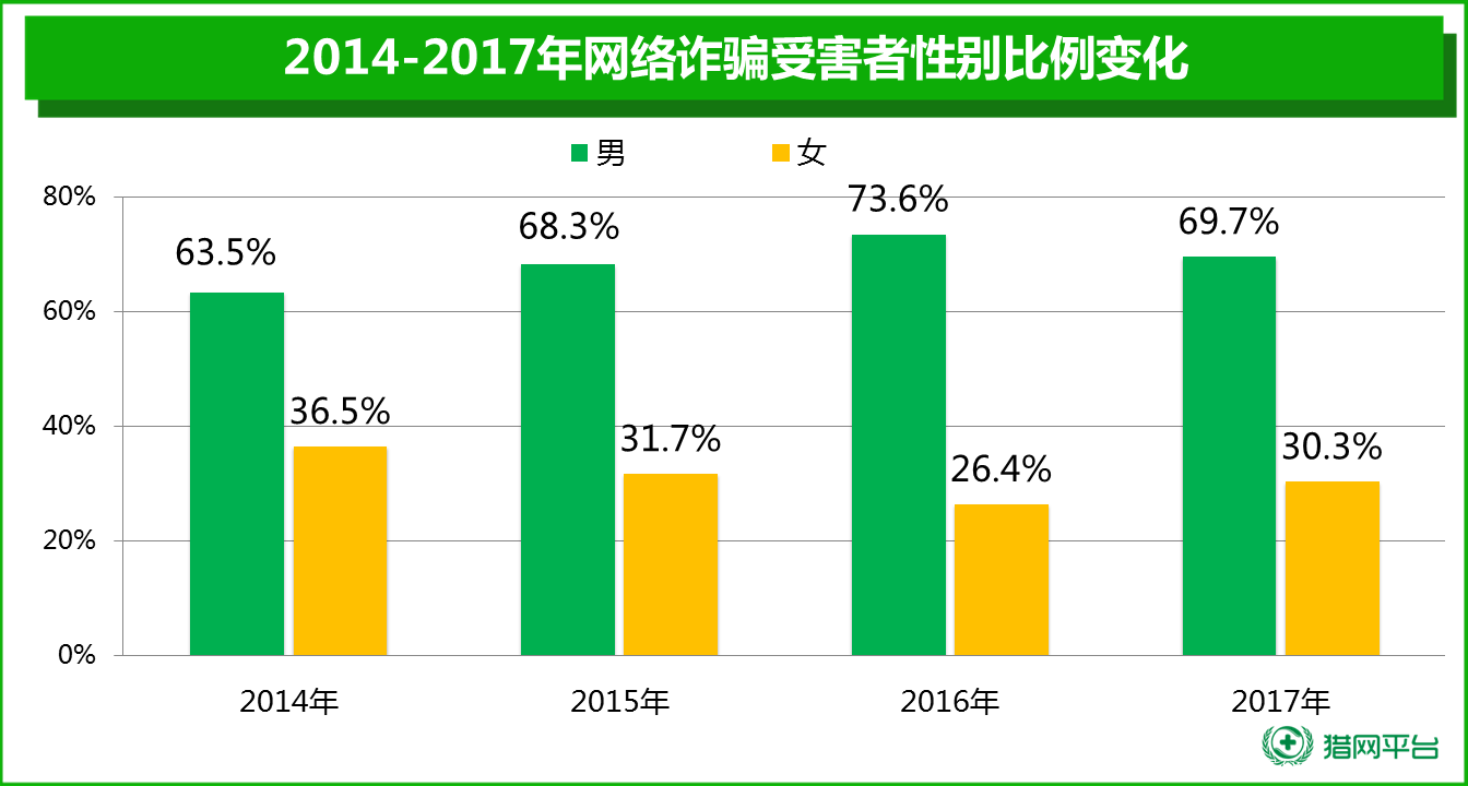 从2014年-2017年的情况来看,男性是网络诈骗受害的主要人群,这与男性本身更爱接触互联网新业务、喜欢尝试冒险的行为有很大关系。