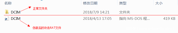 第三步:借助用户会不定期使用PC来浏览移动端手机里照片的一种习惯,当受到移动端攻击的目标,使用PC浏览移动端手机里的照片,一旦被诱导触发到伪装后的“图片目录” (该伪装对于普通用户较难识别发现,见图2.3),即运行起该PE RAT攻击文件,从而使PC遭受RAT攻击。