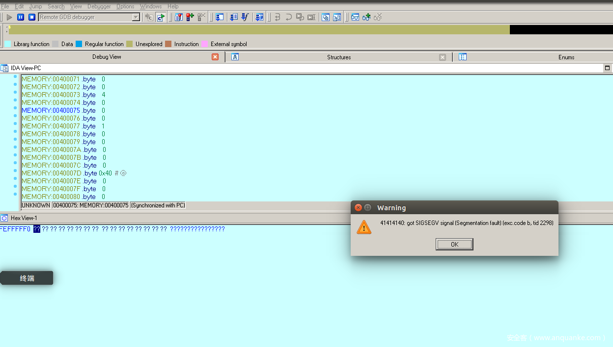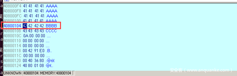查看HEX VIEW-1窗口,发现返回地址已经被覆盖为0x42424242,如下图所示,此时缓冲区已经被输入的数据所覆盖,并且越界后覆盖了堆栈上的其他数据;
