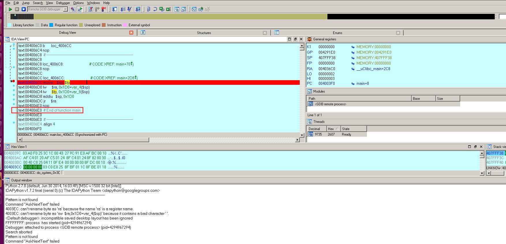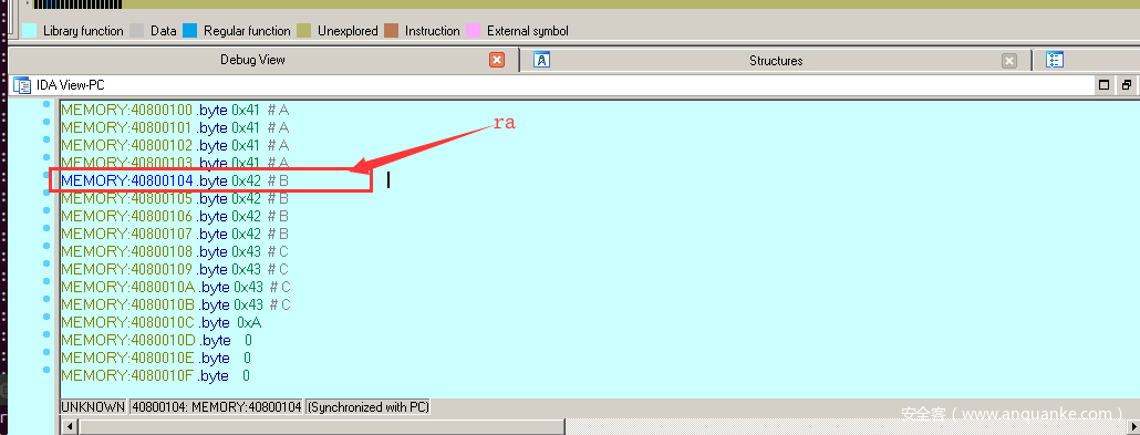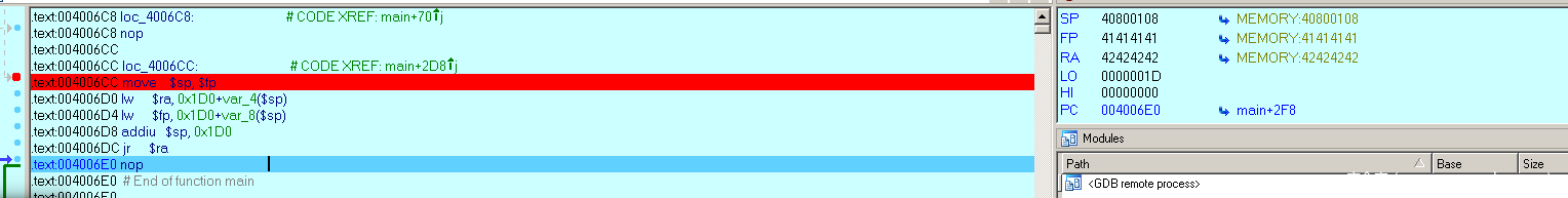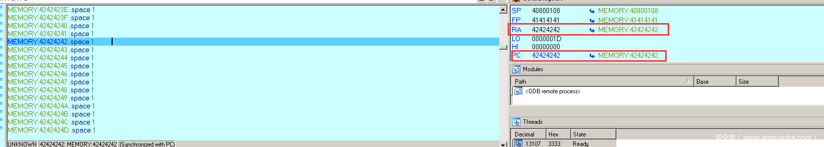 继续按F8键执行指令jr $ra,程序就会跳往0x42424242出执行,如下图所示: