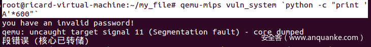 root@ricard-virtual-machine:~/my_file# qemu-mips vuln_system `python -c "print 'A'*600"`