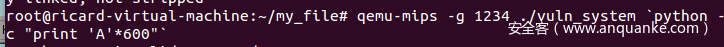 root@ricard-virtual-machine:~/my_file# qemu-mips -g 1234 ./vuln_system `python -c "print 'A'*600"`