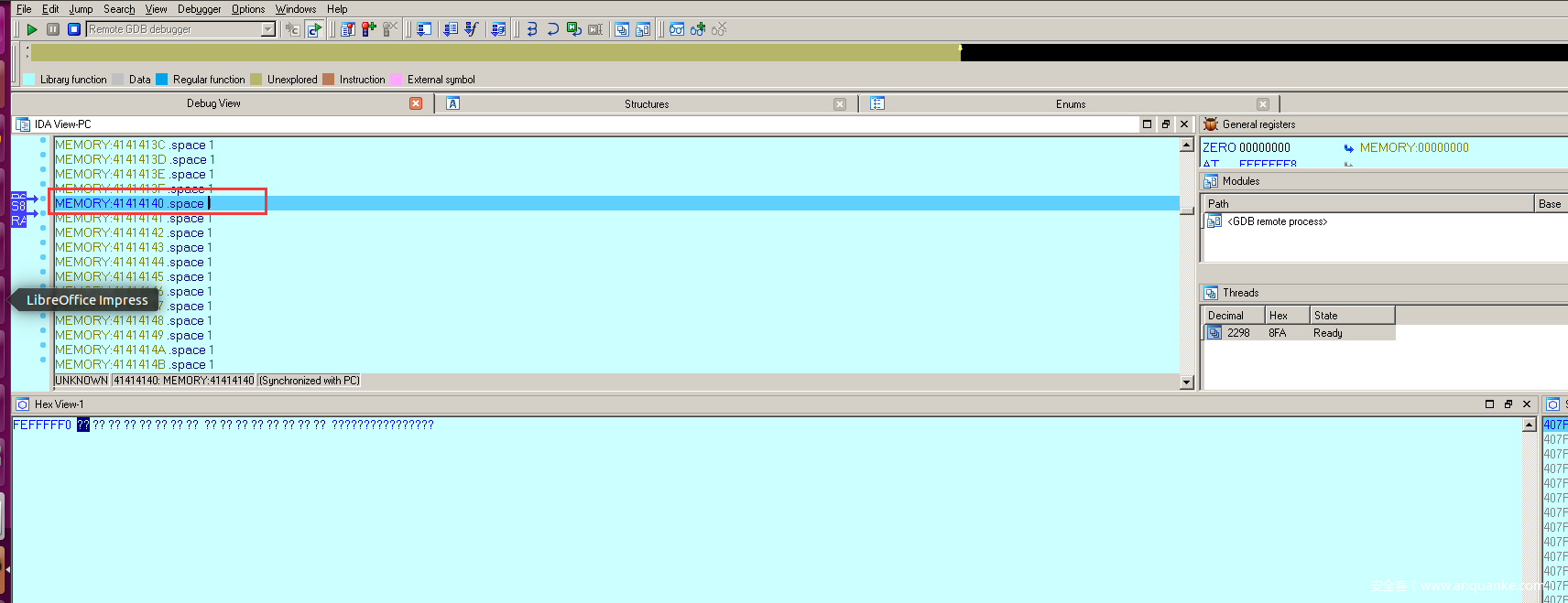 附加之后,在IDA里面按F9键(书里面写的是F5,,这是错的!)可以看到程序在试图执行0x41414141的时候崩溃了,如下图所示:
