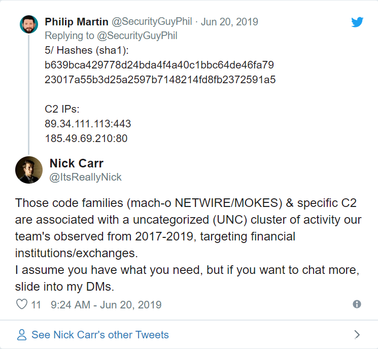 Phil提供的哈希值(23017a55b3d25a2597b7148214fd8fb2372591a5)刚好与用户发给我的恶意文件相匹配。此外用户还提到一个信息,最近他“参与了加密货币交易事宜”。综合这些信息,很有可能我和Phil讨论的都是同一个Firefox 0day。