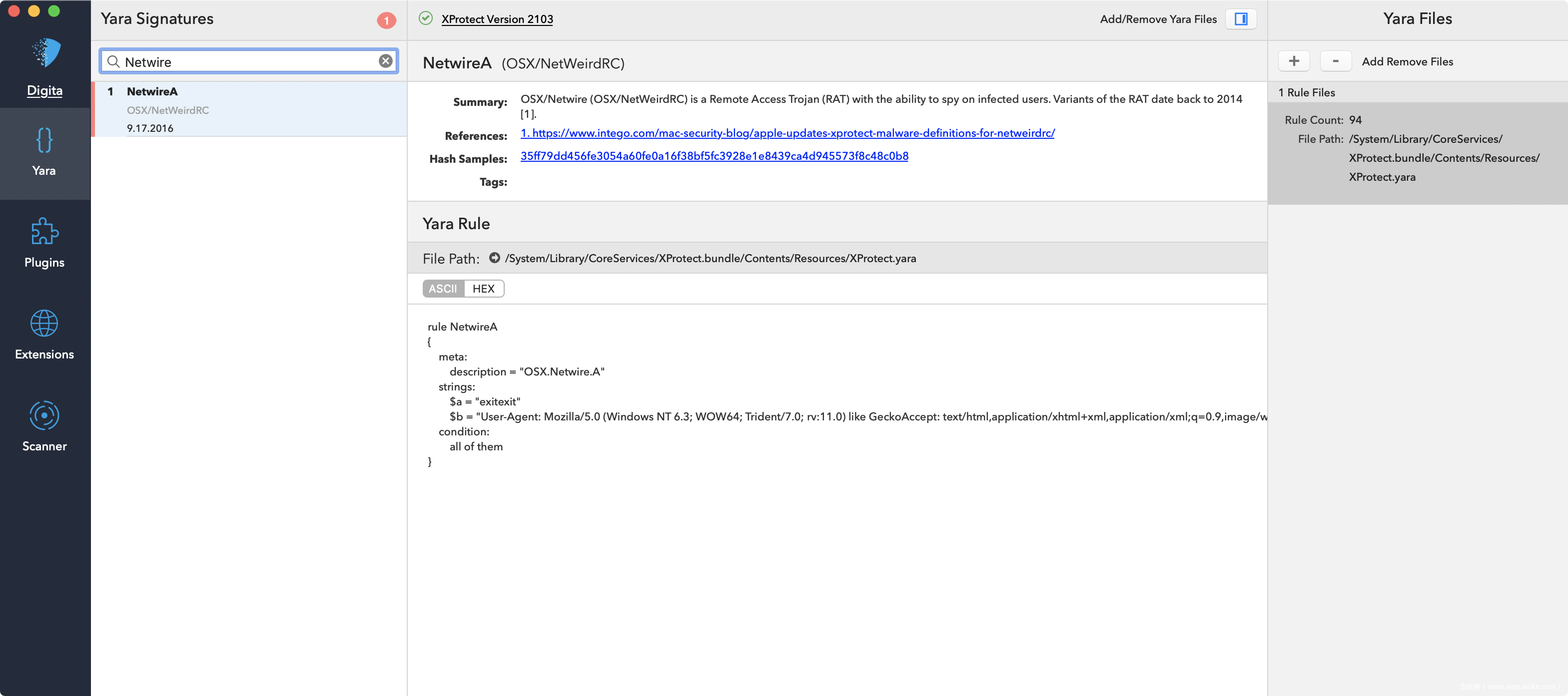 2016年,Apple添加了一个Yara特征,用来检测OSX.Netwire.A。这个特征(参考/System/Library/CoreServices/XProtect.bundle/Contents/Resources/XProtect.yara)如下所示: