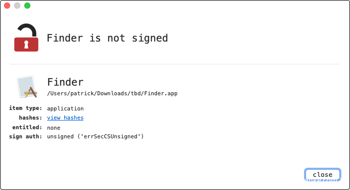 $ shasum -a 1 ~/Attack/Finder.app/Contents/MacOS/Finder