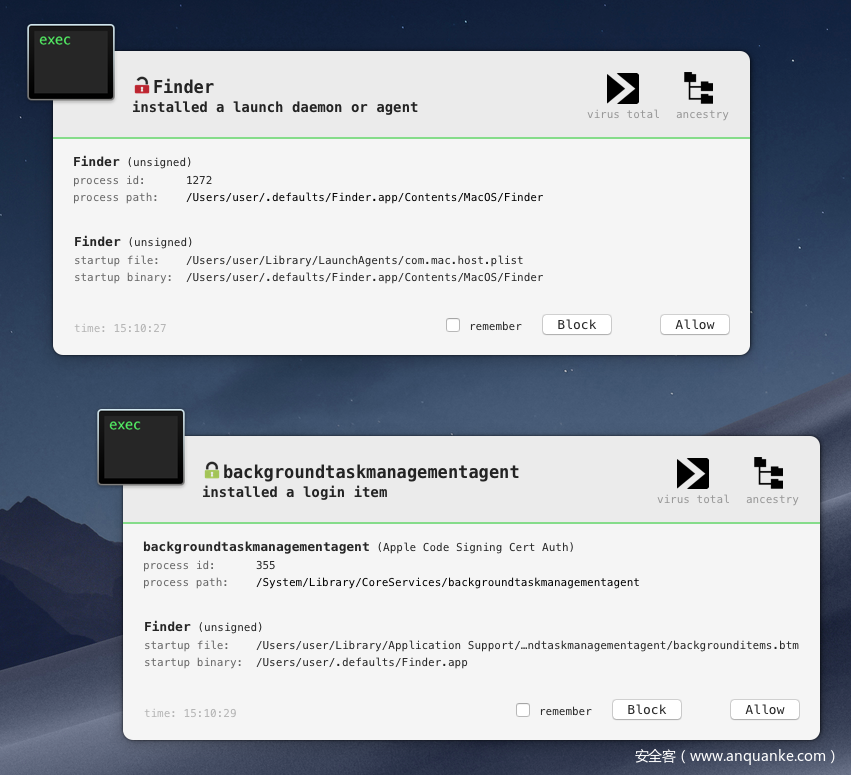 采用两种驻留机制是不是比一种机制更好?不一定,如果大家使用了Objective-See提供的BlockBlock工具,就能轻松检测到这两种驻留机制: