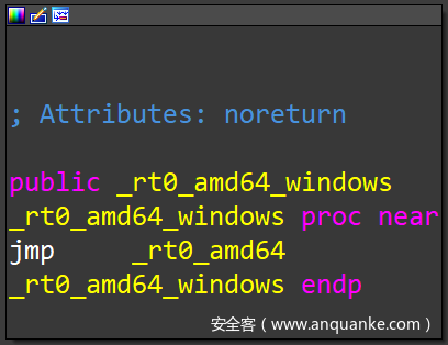 通常,在 IDAPro 中打开一个可执行二进制文件,IDAPro 的自动化分析过程结束后,会自动跳转到一个入口函数的位置,等待我们分析。对于 Go 二进制文件来说,64bit PE 文件通常会自动跳转到 _rt0_amd64_windows 函数: