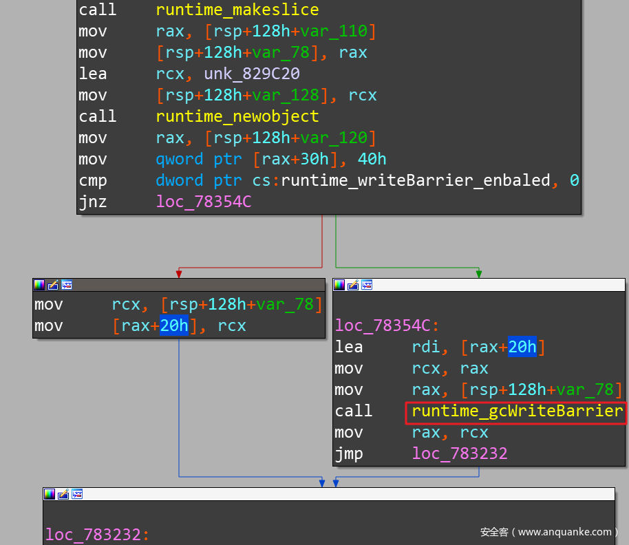 上图的流程,是把 runtime.makeslice() 生成的 slice (var_78) 的地址,写入 [rax+20h] 中。在 64bit Go 二进制文件中,调用 runtime.gcWriteBarrier() 时,总是把目标地址放入 rdi ,把源地址(值)放入 rax。