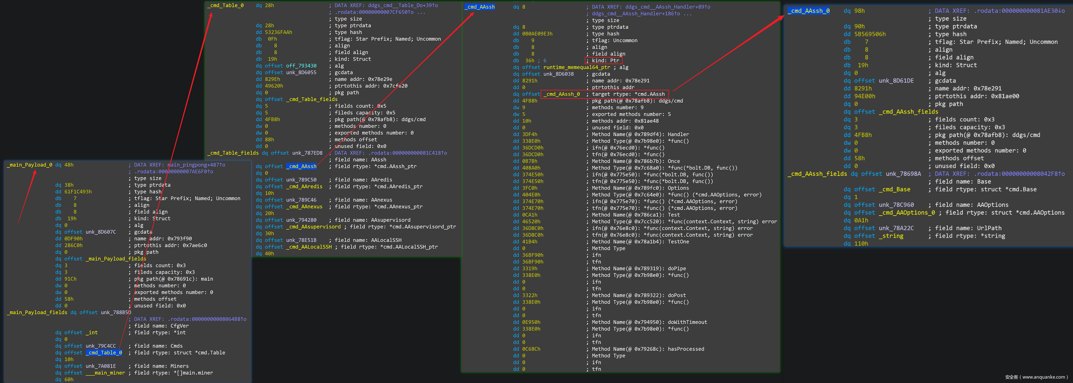 当然,上面效果图只是 main.Payload Struct 定义的一部分内容,通过 go_parser 的解析,我们可以很方便地在 IDAPro 中,从该数据类型定义的起始位置开始,通过双击跳转到特定位置的操作,一步一步深入查看每一层、每一个字段的定义。完整的结构我梳理如下: