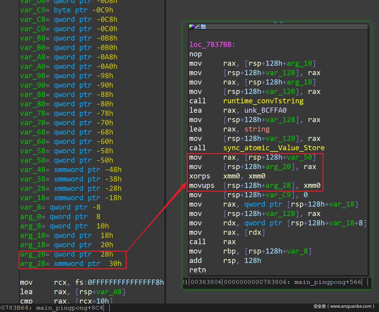 可以看到,函数头中显示共有 6 个 arg_* 的变量,而函数尾部显示最后的 arg_20 和 arg_28 分别被传入两个值以后,函数返回。据此可以确定最后两个 arg 就是函数的返回值,而前面 4 个 arg 就是函数需要传入的参数。其实,用 IDAPro 打开 Go 二进制文件中的函数来分析,如果函数有返回值的话,返回值总是最后面的 arg,即距离栈底较近的位置。