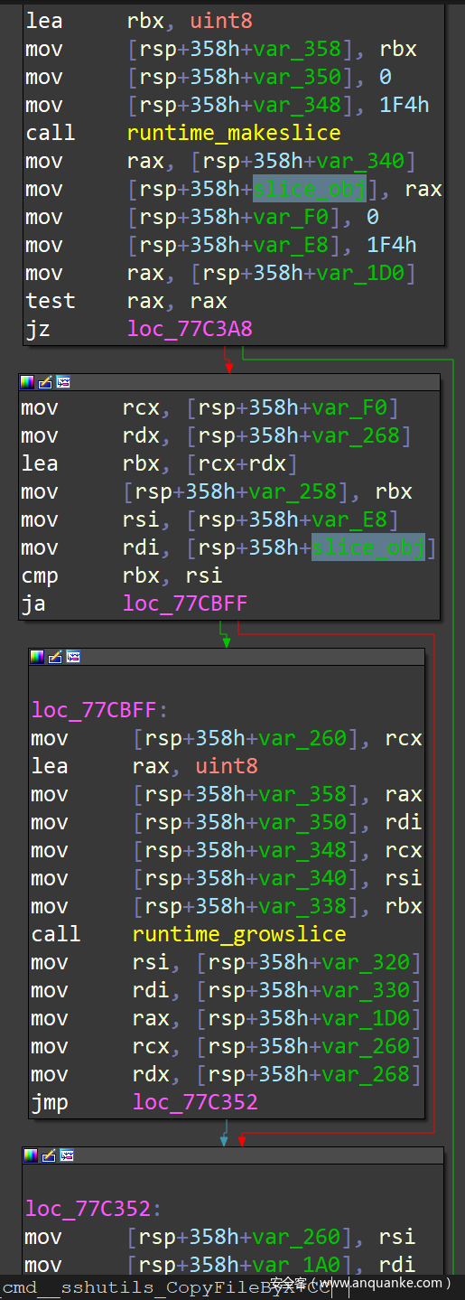 在逆向分析过程中,遇到这种带 runtime.growslice() 的代码块,知道这是在 Slice 容量不足的情况下进行的扩容操作即可。这块代码不一定会执行,粗暴一些甚至可以直接忽略,直接去看这块代码前后的代码,这块代码前后的代码,才是业务逻辑中真实操作 Slice 中元素的代码。