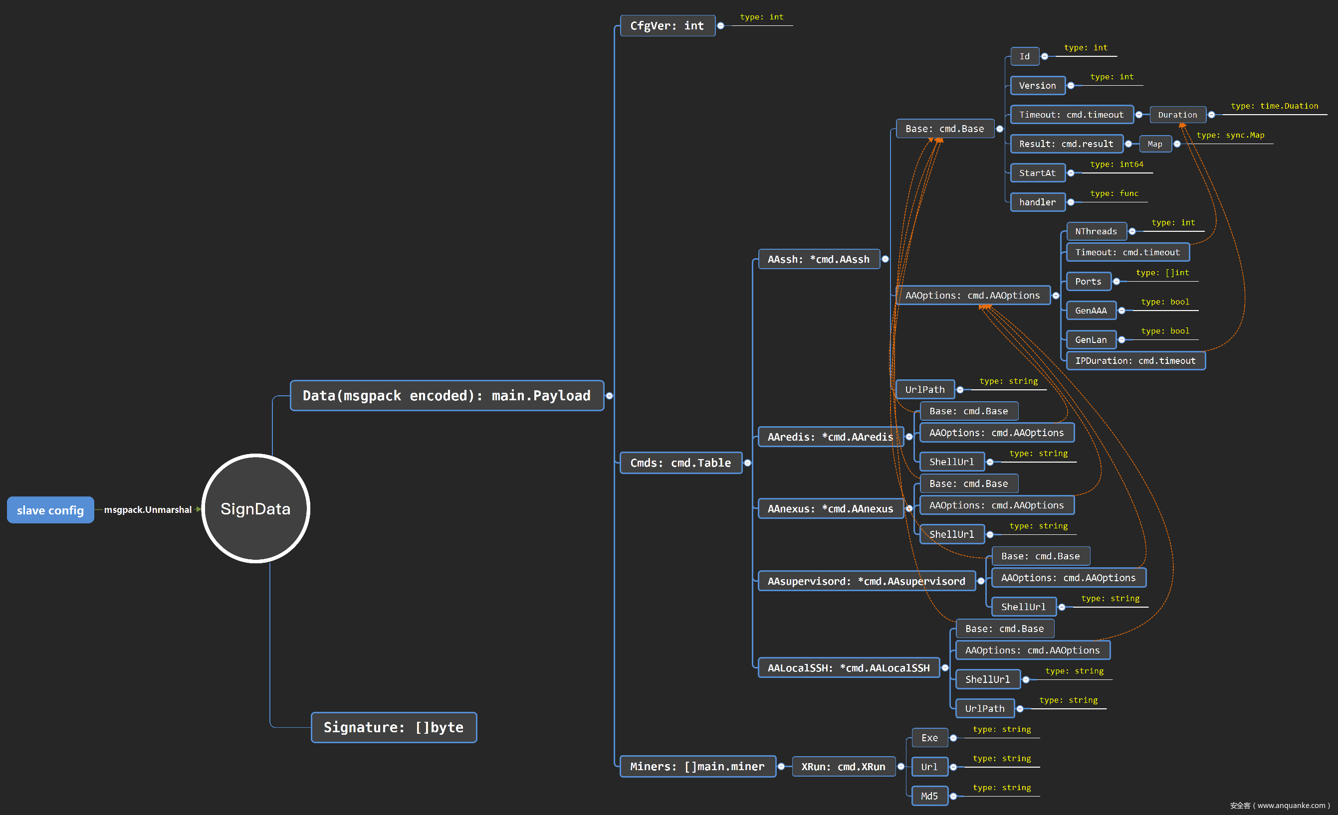 上图左边和右上方的代码块,显示该函数先用 common.SignData 这个 Struct 类型来对 C&C 返回的数据执行解码操作。然后右下方的代码块又用 main.Payload 这个 Struct 类型,对前面解码出来的部分数据进行第二层 msgpack 解码操作。