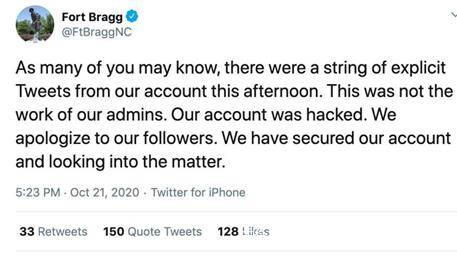 当地时间21日,美国布拉格堡军事基地(Fort Bragg)官方推特发布了多条含有“淫秽信息”的推文。引起社交平台热议。同日,该陆军基地澄清,称账号“被黑客攻击”。然而,网友对此并不买账,有人讽刺称“可能是基地工作人员忘记切换账号了”