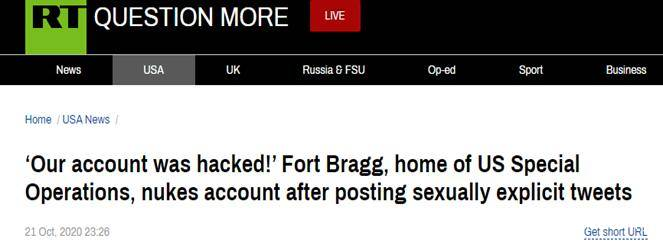 美国陆军基地推特发布淫秽信息 急忙澄清”被黑了”