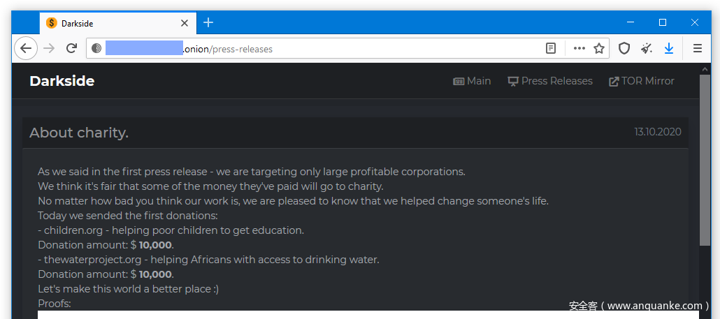 10月13日黑客团队Darkside在网站发布了一则帖子:“我们决定,将把大公司们支付的部分赎金用于慈善事业。”
