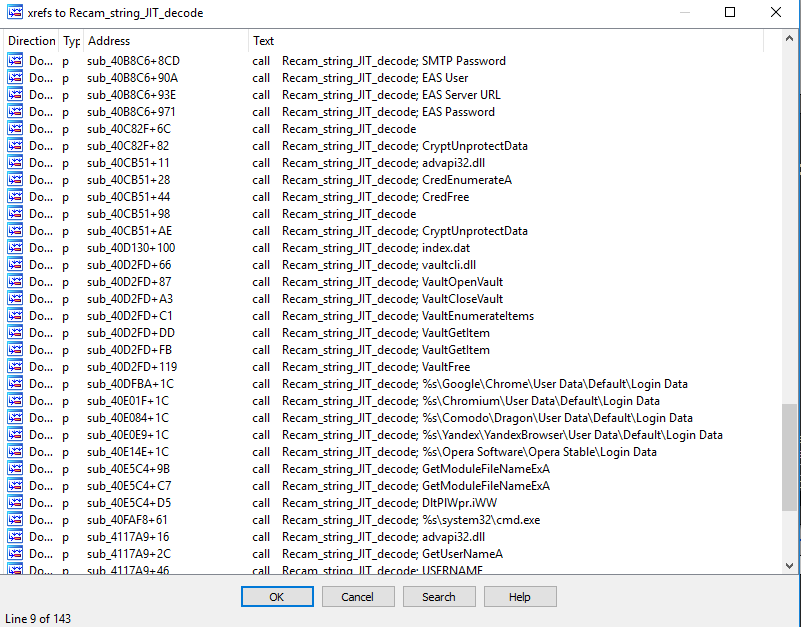 这个去混淆函数比较少用,主要是通过单字节XOR(异或)循环完成解码任务。另一个解码函数较为常用,该函数使用JIT(Just-In-Time)技术,依赖于硬编码的一个解码密钥。幸运的是,IDA Pro的Appcall功能可以简化这些解码过程。