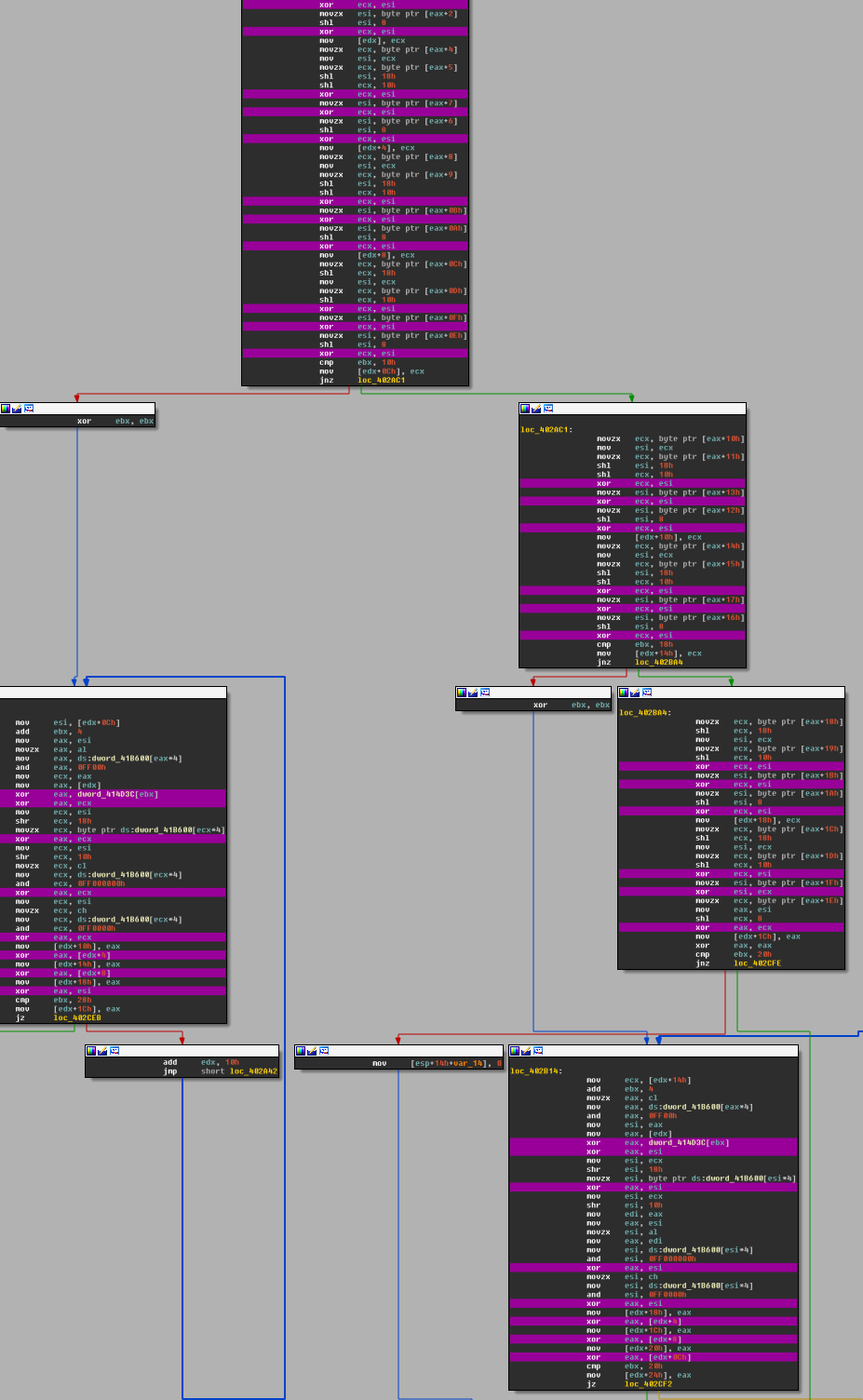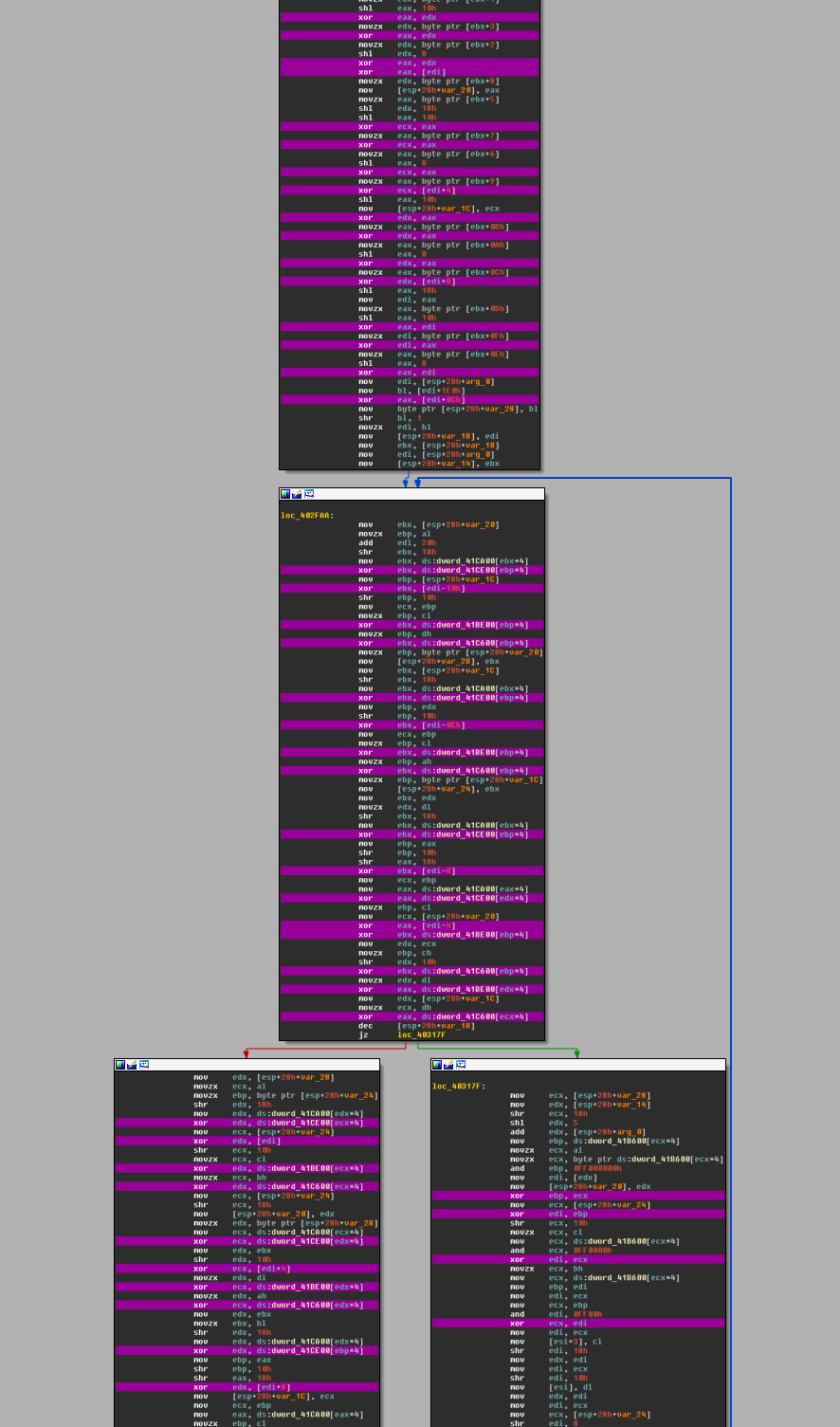 释放出的程序经过vanilla UPX加壳处理过。这部分很容易解开,棘手的是下一阶段。当原始的OEP(Original Entry Point)恢复后,程序开始使用一些自制的加密初始化过程来处理某些值,整个运行周期中会经常用到这些值。初始化过程结束后,这些值中大多数保持不变,但有些会随着时间发生改变。随后不久程序会初步解开某些混淆字符串,其中包括一个硬编码在程序中的命令控制(C2)服务器IP地址。