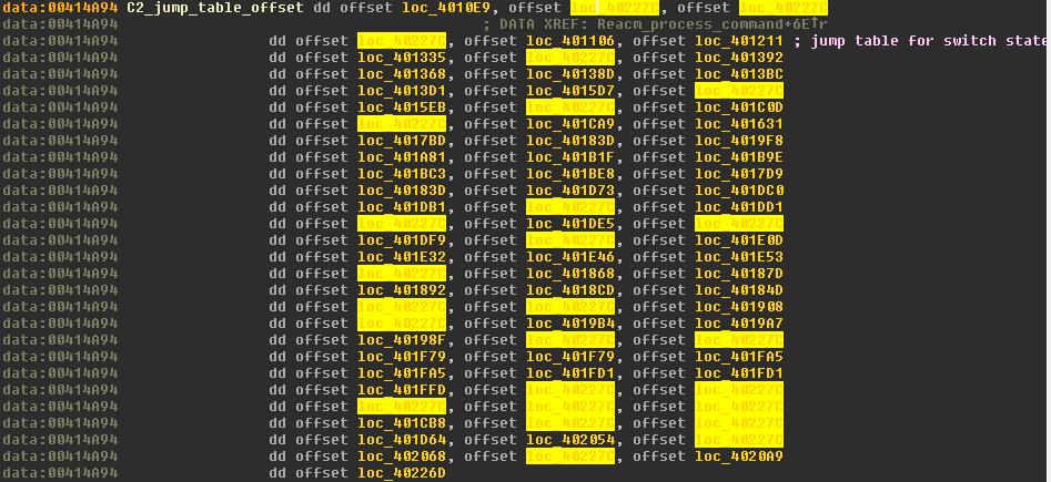 从跳转表中可知,服务器可以返回82种命令。然而,这些命令有所重复。比如,下图中高亮标出了一些偏移地址,当没有执行任何操作时,许多跳转地址最终会跳转到同一个地址(RVA 0x227C)。