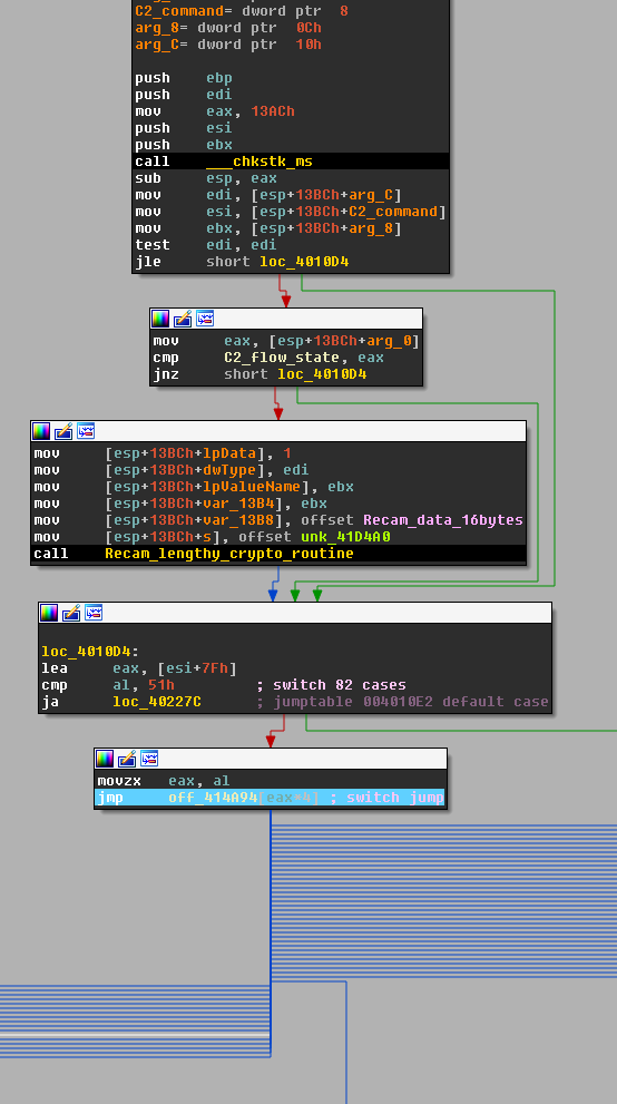 响应数据及后续数据(如果存在的话)会被送到一个大型跳转表中,跳转表用来检查命令字节,根据服务器发送的指令进一步执行后续动作。