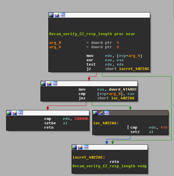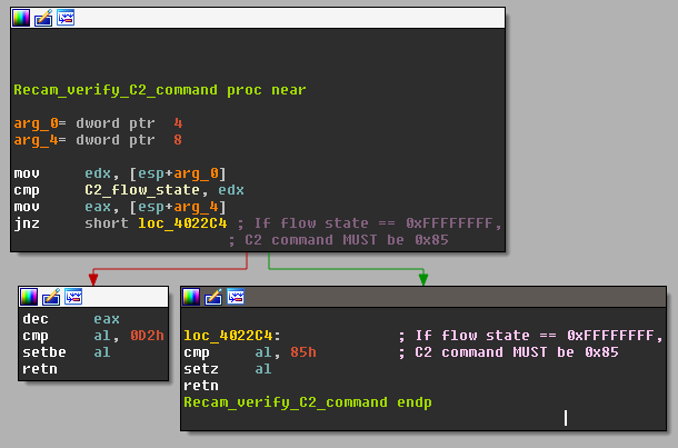 此时,代码执行流程取决于某个流状态标签,整个程序中这个标签的值设置了若干次(初始设置为0xFFFFFFFF)。就响应数据长度及C2命令而言,这个标签进一步规定了这些数据中每个属性的具体值。比如,负责检查响应数据长度的函数也会检查流状态标签。如果状态发生改变,函数会检查消息长度是否超过0x30000。如果标签处于默认状态,函数会检查长度值是否为0x41(信令消息及预期响应的长度)。对于命令数据而言,默认状态会检查通信中的信令阶段是否设置了命令字节(0x85)。一旦发生改变,函数会检查命令字节是否小于或等于0xD2。