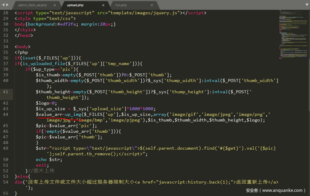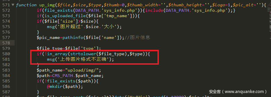 在admin/upload.php中的第44行发现,上传调用了up_img()函数,跟进去看看: